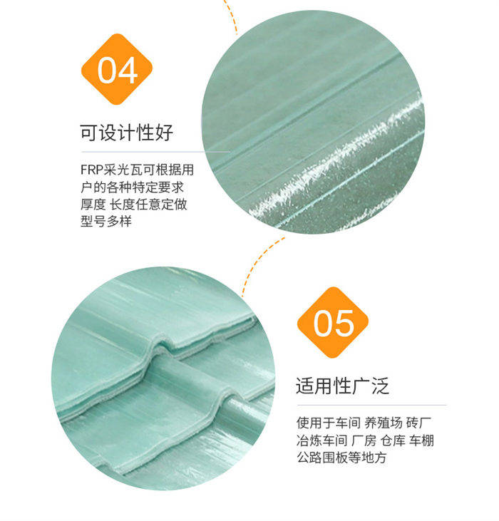 玻璃鋼采光瓦具有連續(xù)成型、無限延長、輕質(zhì)高強(qiáng)、耐老化、透光、阻燃、尺寸精確、表面光潔、隨意著色、免維護(hù)、綠色環(huán)保等特點(diǎn),產(chǎn)品廣泛用于大型建筑、現(xiàn)代輕鋼結(jié)構(gòu)彩色壓型板、溫室大棚、體育場館、水產(chǎn)養(yǎng)殖等場所。
